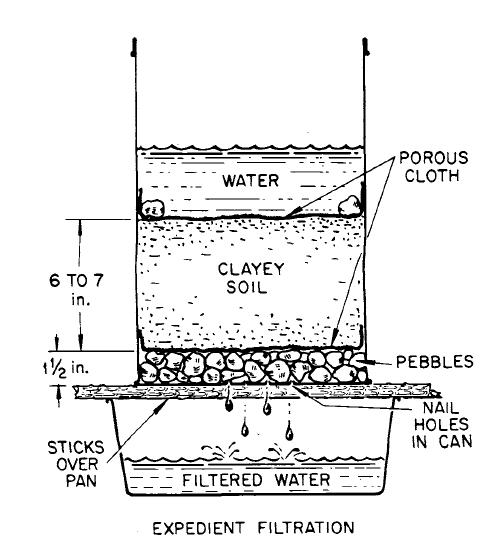 Filtering through earth removes essentially all of the fallout particles and more of the dissolved radioactive material than does boiling-water distillation, a generally impractical purification method that does not eliminate dangerous radioactive iodines. Earth filters are also more effective in removing radioactive iodines than are ordinary ion-exchange water softeners or charcoal filters. In areas of heavy fallout, about 99% of the radioactivity in water could be removed by filtering it through ordinary earth.You can make an Expedient Filter this way: